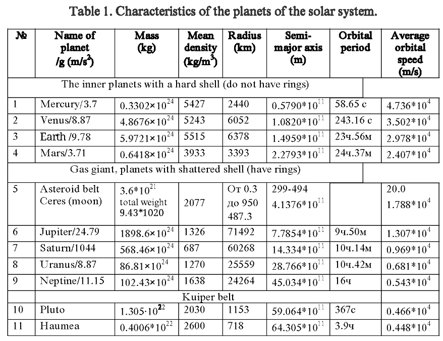 Table 1 sets out the main characteristics of the planets of the Solar System (hereinafter the SS). The asteroid belt (destroyed planet Phaeton) in the table is represented by its moon Ceres. Two dwarf planets: Pluto and Haumea represent the Kuiper belt.The data for the Table 1 has been taken from Wikipedia 07.07.2014 and may not match the further changes.