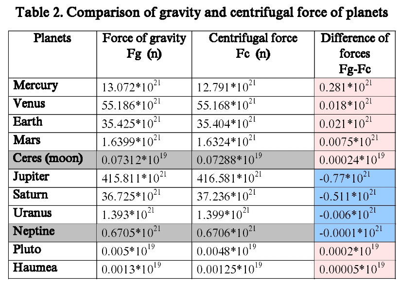 The results of calculation of the gravity force and centrifugal force for the 11 planets are shown in table 2 in the order of their distance from the Sun.