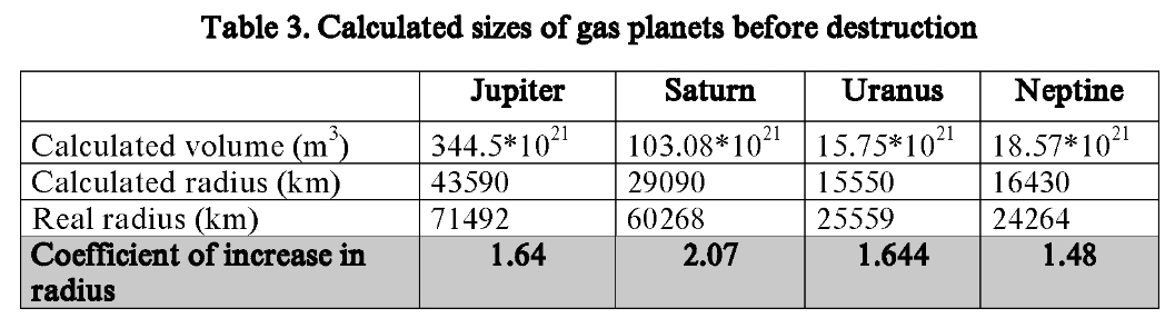 Using the calculated volume (l.1 tab.3), it is possible to calculate the radius of planets before destruction (l.2 tab.3) by a formula: R3=3V/4π. Table 3 shows, that Saturn has the greatest coefficient of increase 2.07, and the Neptune has the smallest coefficient of increase 1.48 (l.3, tab.3). The Uranus before destruction was smaller in volume, than Neptune and after the destruction became larger than it. On the basis of the calculated data, received in table 3, it is possible to present an evident expansion of planets after destruction.