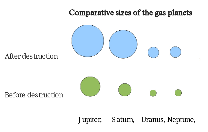 The picture shows a significant increase in the size of gas giants after the catastrophe. After destruction of planets, the speed of axial rotation has considerably increased, on average up to 10 hours/day, except the Neptune – the 16 hours/day. Increase in the equatorial diameter is a result of high-speed axial rotation of these planets. Some dwarf planets have similar characteristics, for example, Houmea. Perhaps, their crust has been destroyed too.