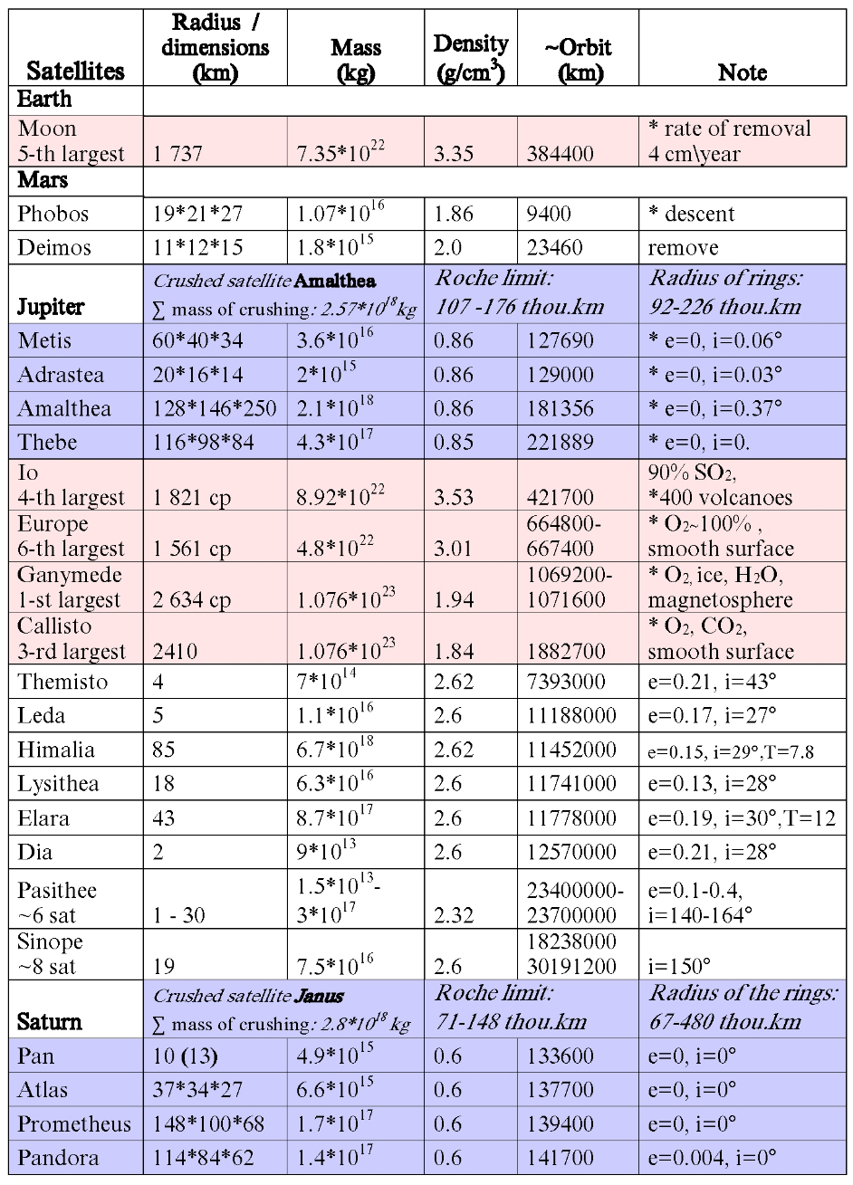 As it can be seen from Table 4, all the fragments of destroyed satellites are in zone of rings, on orbits nearest to planet, in Roche limit (blue color). All gas giants, behind a zone of destruction, have moons (pink color), and then the others satellites. Probably, the destroyed satellites were also the moons.