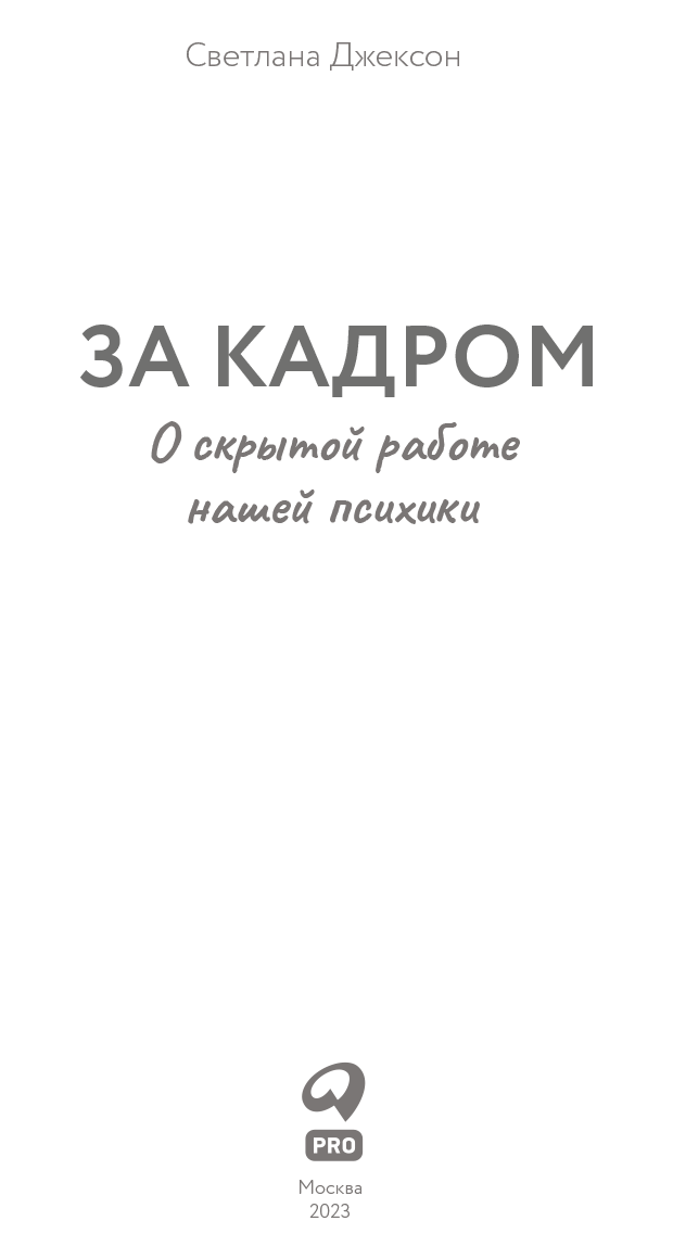 Ирина Млодик, психотерапевт, кандидат психологических наук, автор книг по психотерапии, в числе которых – «Книга для неидеальных родителей, или Жизнь на свободную тему», сооснователь площадки «Место, где можно»Если ваше душевное равновесие расшатано, а в отношениях с другими людьми больше вопросов, чем гармонии с безопасностью, но у вас пока не получается дойти до психолога – смело начинайте изучать книгу Светланы Джексон «За кадром». Именно изучать (я не ошиблась в термине). Это произведение не получится пролистнуть за один вечер. Наполнение книги погружает в глубинные механизмы работы человеческой психики, которые описаны доступным языком и приправлены юмором.