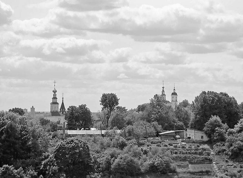 От вершины купола Успенского собора профиль панорамы Владимира медленно понижался к Ветшаному городу, дробный силуэт которого создавали шатры крепостных башен и верхи деревянных храмов.