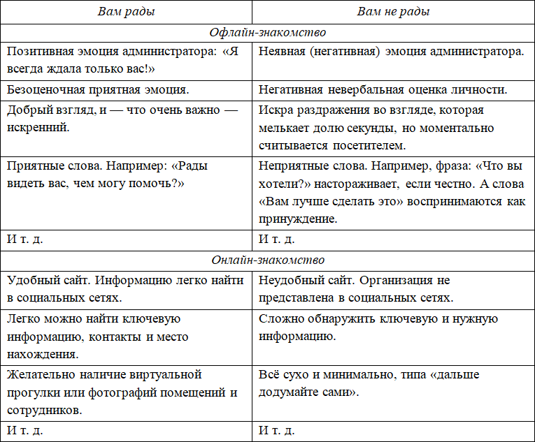 Вот, например, встречающий сотрудник. Здесь важны внешний вид и его уместность, манера речи и её тон, доброжелательность или безразличие, искренность и притворство, обаяние и привлекательность, положительный настрой и желание помочь; корректность поведения и общения и многое другое.