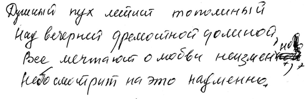 Душа пуста как котелок,В котором каши нет,Душа пуста как лампа та,В которой гаснет свет.Душа пуста как тот цветок,Что поздней осенью умолк.Душа – тончайшая струна,Безмолвья грустная странаПод жизни ледяным венцомПред неизбежным всем концомО бытии не говорит,Лишь в небо вечности глядит,Где звёзды водят хоровод,Качаясь в зыбке тёмных вод.Душа пуста – до бездны дна –Небытию обречена.«Бессознательное» вечно