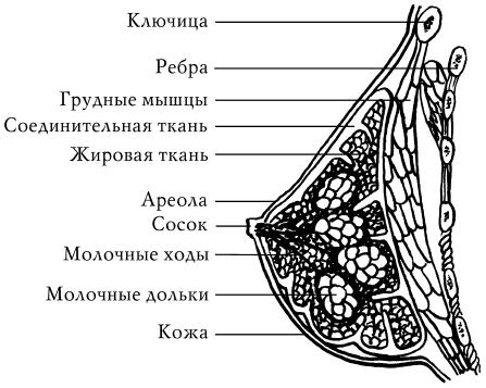 Каждая долька состоит из маленьких мешочков – альвеол («ягод»). В них и происходит образование молока. От мешочков отходят крошечные канальцы – «веточки», которые собираются в один крупный, проходящий в центре дольки. Эти крупные канальцы долек впадают в один общий короткий проток, который заканчивается отверстием на вершине соска. Между дольками имеется прослойка, состоящая из соединительной и жировой ткани. Количество этих тканей и определяет форму груди. Через соединительную ткань проходят кровеносные сосуды, питающие железу, нервы, обеспечивающие чувствительность, и лимфатические капилляры – своеобразные биологические фильтры, собирающие и обезвреживающие микробов, измененные клетки и т. д.