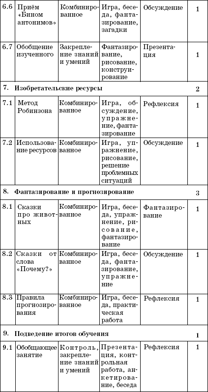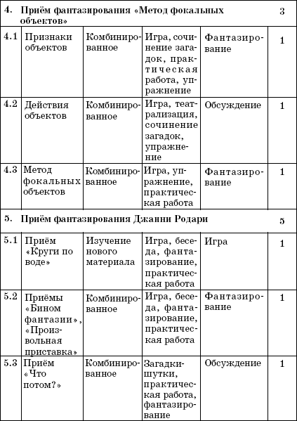 – Основой курса «Мир фантазии» являются приёмы нахождения новых идей, в том числе приёмы развития воображения на базе ТРИЗ (теории решения изобретательских задач). Был отобран материал, позволяющий достаточно быстро и легко научить детей алгоритмам создания собственных творческих продуктов: сочинению загадок, игр, сказок и др.