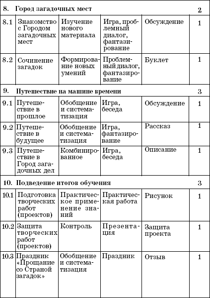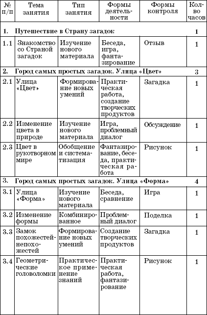 Небольшая книжка вышла большим тиражом, но многие учителя брали из неё только схемы-опоры для составления загадок, которые затем использовали на уроках. Можно, конечно, поступать и так. Но можно «Страну загадок» превратить в отдельный курс, увлекательный и необычный, изучать который лучше всего в рамках внеурочной деятельности детей на базе общеобразовательной школы или учреждения дополнительного образования. Курс может преподаваться как самостоятельный и как первая часть курсов «Мир человека», «Мир фантазии», «Мир логики».