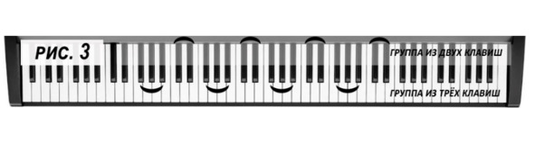 Обратите внимание на чёрные клавиши. Они сгруппированы в группы по две и три (рис. 3).