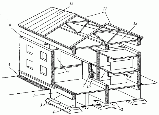 Рис. 1. Схема двухэтажного дома: 1 – фундамент; 2 – пол подвала; 3 – гидроизоляция; 4 – стены подвала; 5 – отмостка; 6 – наружные стены; 7 – внутренние стены; 8 – междуэтажные перекрытия; 9 – перегородки; 10 – лестница; 11 – стропила; 12 – кровля; 13 – чердачное перекрытие