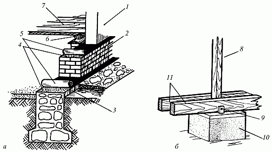 Рис. 2. Виды фундаментов: а – ленточный; б – столбчатый; 1 – стена; 2 – цоколь; 3 – отмостка; 4 – раствор цемента; 5 – гидроизоляционный материал; 6 – лага; 7 – пол; 8 – стойка; 9 – анкер; 10 – столб; 11 – лаги