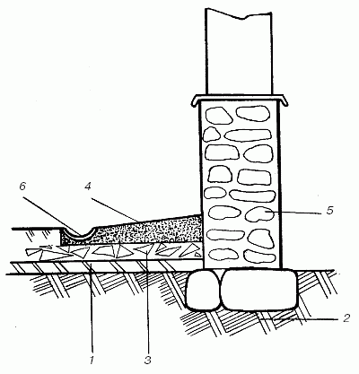 Рис. 3. Отмостки: 1 – грунт; 2 – слой мягкой глины; 3 – слой гравия, щебня или битого кирпича, смешанного с песком; 4 – слой цементного раствора; 5 – канавка; 6 – фундамент