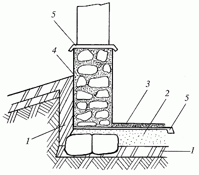 Рис. 4. Гидроизоляция стен погреба: 1 – жирная глина; 2 – бетон; 3 – пол из цемента; 4 – цементная штукатурка, покрытая слоем битума; 5 – гидроизоляционный слой
