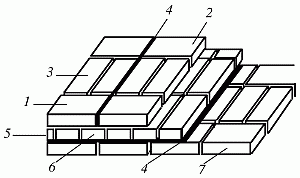 Рис. 6. Элементы каменной кладки: 1 – наружная верста; 2 – внутренняя верста; 3 – забутка; 4 – горизонтальный и вертикальный швы; 5 – фасад; 6 – тычковый ряд; 7 – ложковый ряд