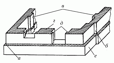 Рис. 8. Детали каменных конструкций: а – обрез; б – уступ кладки; в – пилястры; г – простенок; д – четверть; е – цоколь