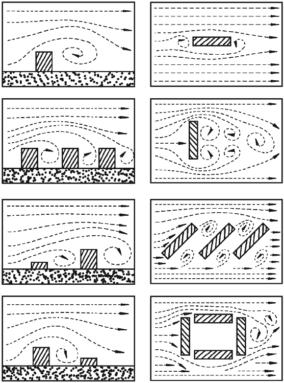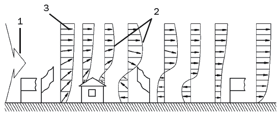 Следует отметить, что связь между ветровым потоком и постройкой взаимообратная. Дело в том, что не только ветер оказывает определенное воздействие на конструкцию, но и она сама влияет на свойства движущихся воздушных масс. В частности, встречая на своем пути сооружение, меняется как направление ветра, так и его скорость, которая значительно снижается. Нередко постройки оказываются причиной формирования потоков воздуха. Именно видом конструкции часто обусловлено направление ветра (рис. 2).