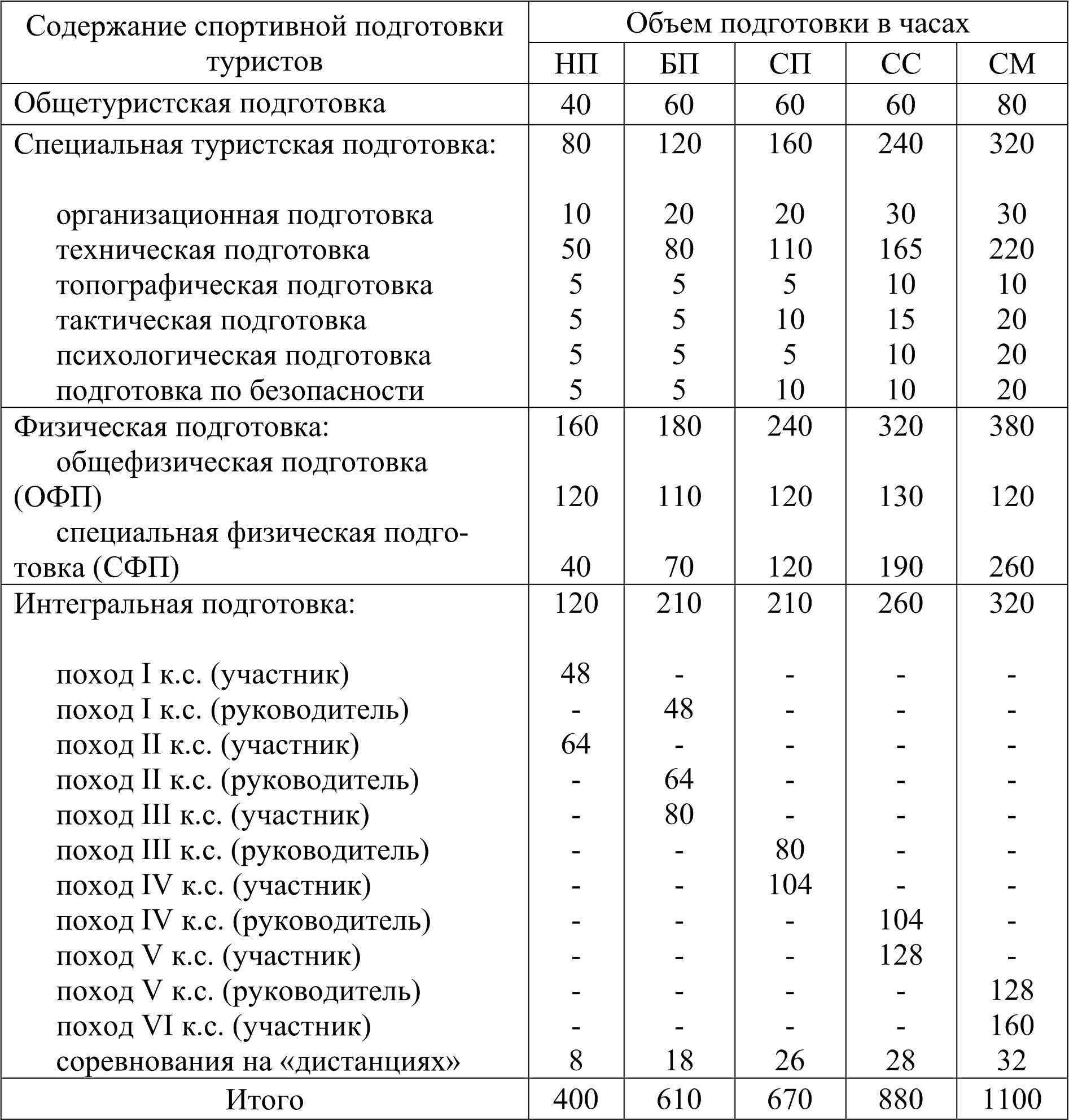 Общетуристская подготовка составляет в группах начальной подготовки (НП) 10 % общего объема подготовки на этом этапе, в базовом этапе (БП) – 10 %, в специализированном этапе (СП) – 9 %, в группах спортивного совершенствования (СС) – 9 %, в группах спортивного мастерства (СМ) – 7 %. Такое распределение в основном отражает существующую практику снижения удельного веса общетуристской подготовки с ростом спортивной квалификации. Отметим при этом, что снижается только удельный вес этой подготовки, а не абсолютные значения в объемах, так как на этапах спортивного совершенствования и спортивного мастерства необходимо более углубленное изучение теории и практики спортивно-оздоровительного туризма, повышение инструкторской и судейской квалификации, что невозможно без достаточного объема общетуристской подготовки.