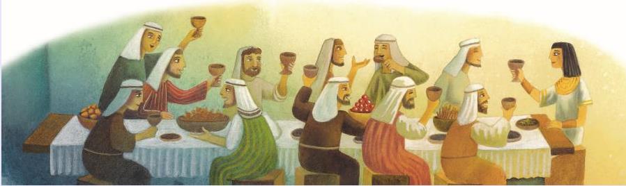 Потом, умыв лицо, Иосиф вернулся к ним и велел накормить их хорошим обедом. После обеда Иосиф приказал насыпать братьям хлеба в мешки, а в мешок Вениамина потихоньку положил серебряную чашу. Когда братья отправились домой, Иосиф велел догнать их и обыскать, не взял ли кто из них его чашу. Стражники развязали мешки и увидели чашу в мешке Вениамина.