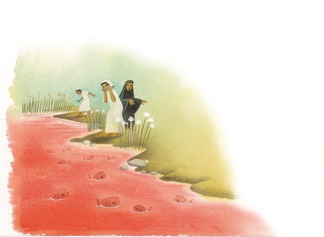 Сначала Моисей поднял свой жезл и ударил им по воде. Тотчас Нил окрасился в красный цвет, а его воды превратились в кровь. От воды исходил отвратительный запах, по реке поплыла мёртвая рыба. Но фараон был непреклонен. Он заявил, что люди могут вырыть колодцы, если им нужна вода для питья. Это бедствие продолжалось семь дней.