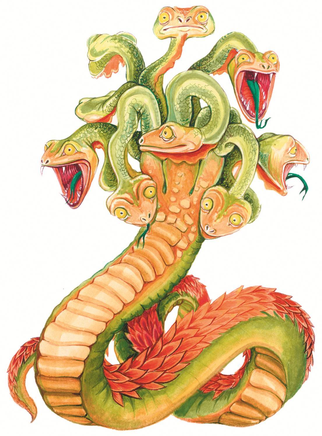 Долгое время никому из древних воинов не удавалось победить злобное создание. Удача сопутствовала лишь Гераклу – великому древнегреческому герою. Он наступил гидре на длинный чешуйчатый хвост и начал палицей сбивать головы. Однако на месте каждой отлетевшей в сторону головы тотчас же появлялись две новые, и гидра становилась все сильнее.