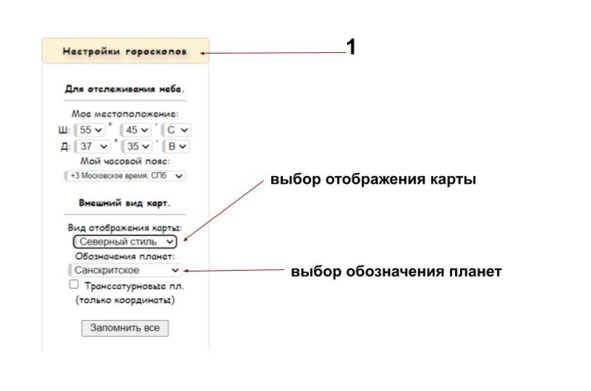 Задаём настройки: Северный стиль карты. Обозначение планет: символы, русские или санскритские названия, как вам удобно.