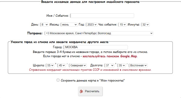 Рекомендую поставить галочку «Сохранить данные карты в „Мои гороскопы“» – это позволит вам позже быстро вернуться к этой карте без необходимости вводить всё заново. Затем нажимаем кнопку «Рассчитать».