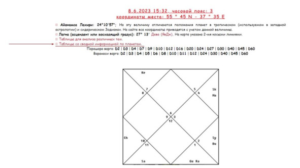После этого вы увидите натальную карту, а если начнёте листать вниз, – большое количество таблиц и аналитических блоков. Не пугайтесь – большинство из них нам сейчас не понадобятся. Эти «страшные» таблицы предназначены для очень глубокого анализа, и мы к ним будем обращаться только при необходимости. На данном этапе нас интересует только одна конкретная таблица.
