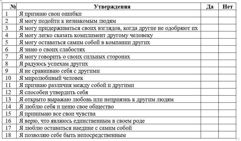 Как люди приходят к убеждению, что они достойны и замечательны или, плохи и никчемны? По каким признакам человек судит о качестве своей и чужой самооценки? Предлагаю определить уровень самооценки по опроснику Р. Полетти и Б. Доббс. Ответьте на утверждения в таблице 1, «да» или «нет» и подсчитайте количество ответов в каждой колонке.
