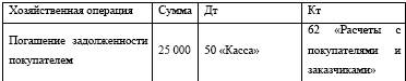 Покупатель оплатил за товар наличными деньгами в размере 25 000 руб. Наличные деньги отражаются в кассе организации, значит, применяем счет 50 «Касса». Все хозяйственные операции с покупателями отражаются с применением счета 62 «Расчеты с покупателями и заказчиками». В данной операции происходит одновременное увеличение денег в кассе и увеличение кредиторской задолженности перед покупателем на одну и ту же сумму.