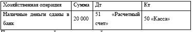 Наличные деньги в размере 20 000 руб. сданы из кассы в банк. Исходя из экономического смысла хозяйственной операции, выбираем соответствующие корреспондирующие счета: 50 «Касса», 51 «Расчетные счета». В кассе деньги уменьшаются, а на расчетном счете увеличатся на эту же сумму. Следовательно, денежные средства уменьшаться по кредиту и увеличатся по дебету, т.е. отправляются с кредита счета 50 в дебет счета 51.