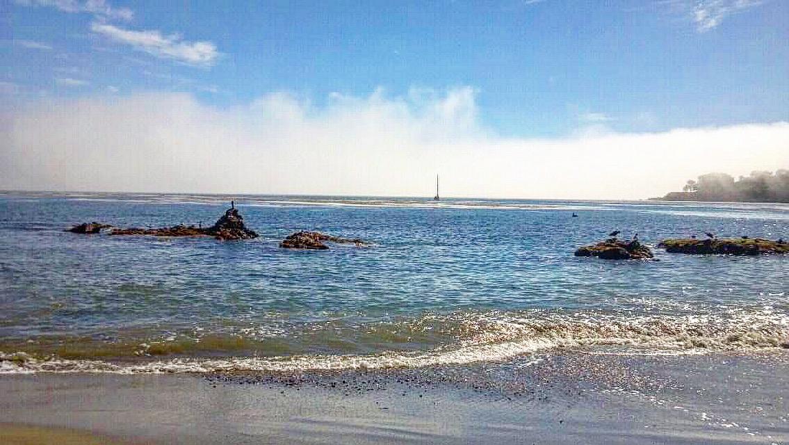 В конце бухточки полоска пляжа обрывалась, заканчиваясь скалой, ступенями спускающейся в воду. Волны с грохотом разбивались о каменную стену; лезть туда мне совсем не хотелось. Осмотревшись, я нашла расселину в скалистом обрыве, по которому можно было подняться наверх. Я надеялась также спуститься с другой стороны, сверху обойдя скалистый мыс. Аккуратно ступая босыми ногами по крутой осыпи, я вдруг замерла от неожиданности: над моей головой кто-то бубнил. Выглянув из-за камня, я увидела мужчину с видеокамерой и стоящую на обрыве ко мне спиной женщину. Она красиво жестикулировала и что-то говорила, обращаясь к камере и показывая руками на залив; меня они не видели. Я выбралась наверх и оказалась на тропинке, петляющей вдоль обрыва. У дороги я заметила микроавтобус с логотипом местной телекомпании. Все стало ясно: скорее всего, клип покажут по новостям в разделе погоды, привлекая туристов к пляжам и экскурсиям Центральной Калифорнии.
