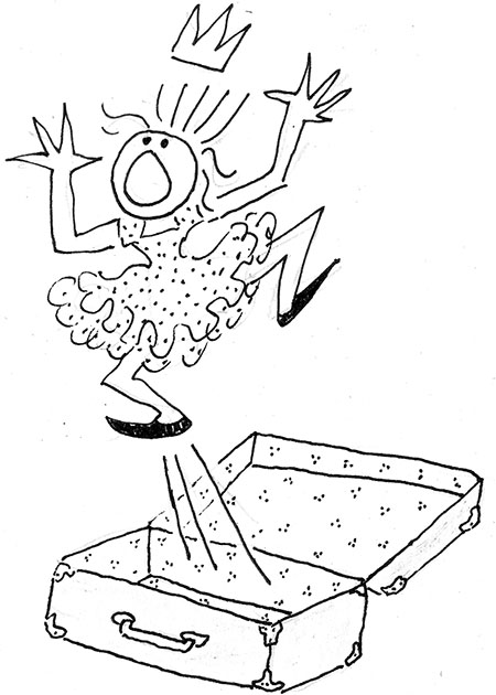– Я же должен был выпустить её сразу, как только приехали! – воскликнул он и расстегнул свой чемодан. Из чемодана выскочила разъярённая Принцесса – его жена.