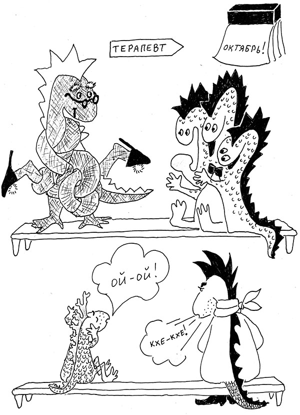 И побежал к врачу, пока жена не проснулась. А то вдруг она его, четырёхголового, разлюбит. У врача уже сидела очередь – Кетчуп хрипел и вместо пламени выдыхал дохленьких светлячков – застудил горло. Дракона Анакондыча скрючил узлом ревматизм, да так основательно, что непонятно было, как этот узел развязать и надо ли его развязывать вообще.