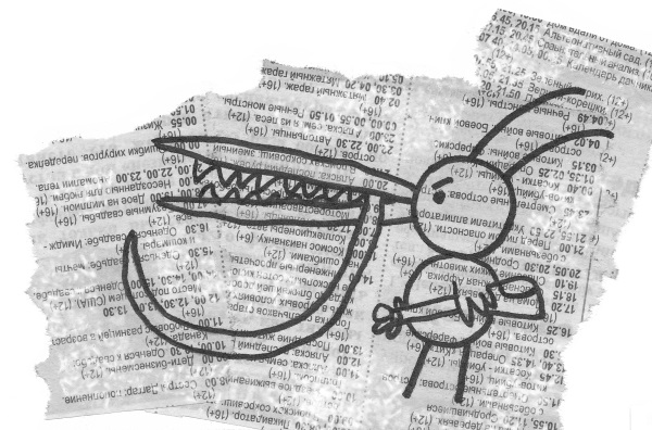 Он нарисовал на полях газеты, развернутой на «Программе телепередач», два маленьких кружка. Потом поставил их на две тонкие палочки – это цыпленок на ножках. В середине верхнего кружка поставил точку – глаз и пририсовал длинный-предлинный клюв. Клюв занял все свободное место, продлился на напечатанную «Программу на 1 января», насквозь пронзил фильм «Ирония судьбы» и уткнулся кончиком в интервью с президентом. Внутри клюва Антон нарисовал много зубов. Цыпленок сразу стал похож на крокодила.
