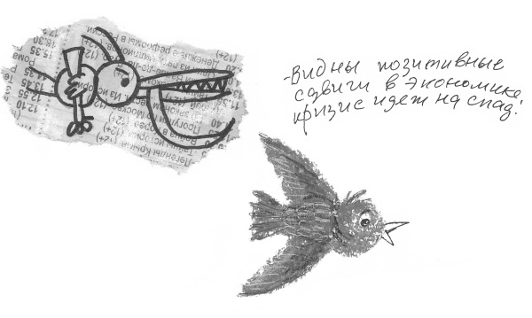 – Видны позитивные сдвиги в экономике, кризис идет на спад, – попытался успокоить ее цыпленок. Осип закрыл второй глаз и притворился спящим.