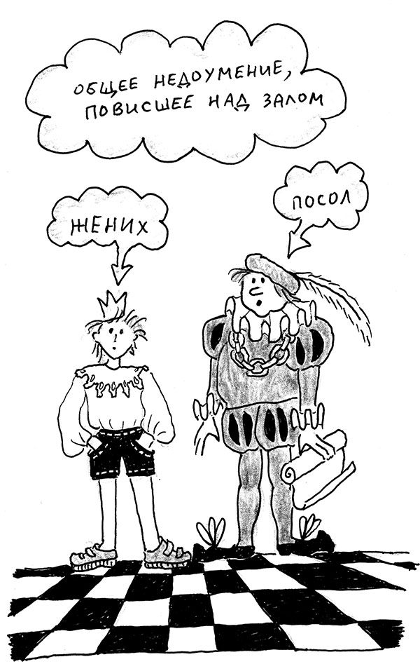 Тут толстый посол поклонился и выдвинул из толпы своих второстепенных послов мальчишку. Видимо, это и был жених. Что-то в нём показалось Принцессе знакомым, но без очков принц расплывался, как клякса в тетрадке. Принцесса милостиво улыбнулась и, свирепея, зашипела уголком рта в сторону отца: