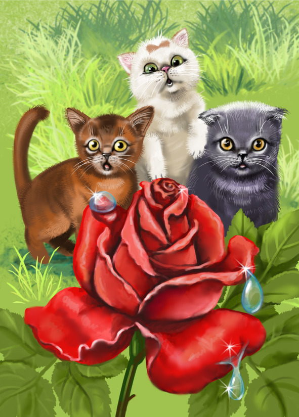 Ранним июльским утром котята Бася, Клепа и Мурка побежали в огород. Им очень нравилось скакать и прыгать по дорожкам между грядками. На цветочной клумбе росла королева цветов – прекрасная роза. Она источала нежный, сладкий аромат. Котята подбежали к розе, чтобы полюбоваться цветком и насладиться её ароматом.