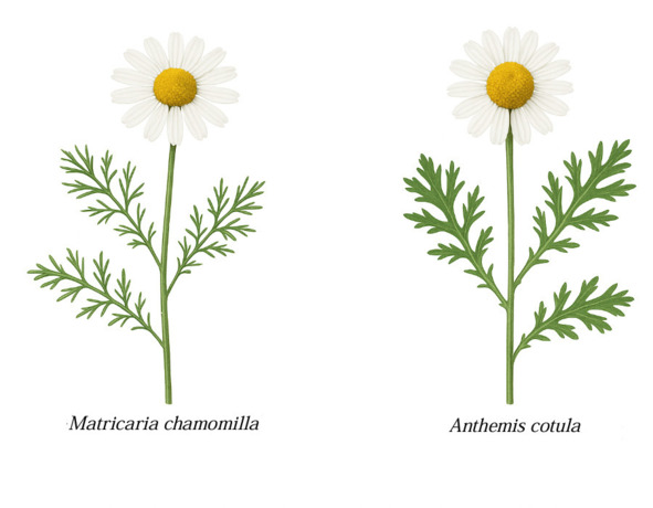 Real chamomile (Matricaria chamomilla) has soothing properties and a sweet scent. Its mimic (Anthemis cotula) has a sharp, unpleasant odour and can cause allergies. The base of Matricaria’s flower head is hollow, whereas that of Anthemis is solid.