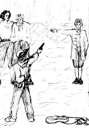 – Это тебе за сопляка! Это тебе за щенка! А это тебе за меня! – приговаривала Янка сквозь зубы, крестя Алексашку шпагой и прижимая его к забору. Потом ловкий выпад вперед и Алексашкина шпага уже у нее в руках. Он испуганно прижался к забору. Янка приставила шпагу ему к горлу: