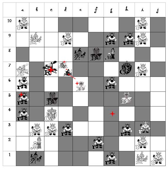 (Темные Странник и Наемник перемещаются на поле d7 к Светлым Страннику и Наемнику)