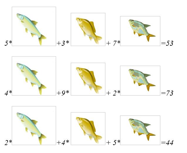 ??? З2.10.1 Однажды сторож отправился на рыбалку и поймал 3 вида рыбок. Количество рыбок удовлетворяет таким уравнениям.