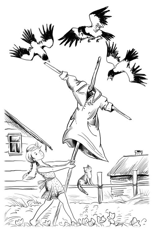 Нахальные вороны так и норовили полакомиться маленькими огурчиками. Галя героически отгоняла их палкой, но они через некоторое время так обнаглели, что перестали обращать внимание на маленькую девочку. «Ну хорошо, сейчас я вам устрою!», – погрозила им пальцем Галя и побежала в дом. «Так… где-то я видела красное платье, которое мама редко носит – только один раз в театр надела, когда мы ходили на «Буратино». Наверное, она его не любит, – говорила себе Галя, роясь в мамином шкафу. – А, вот, нашла! Сейчас я вам чучело сделаю!».