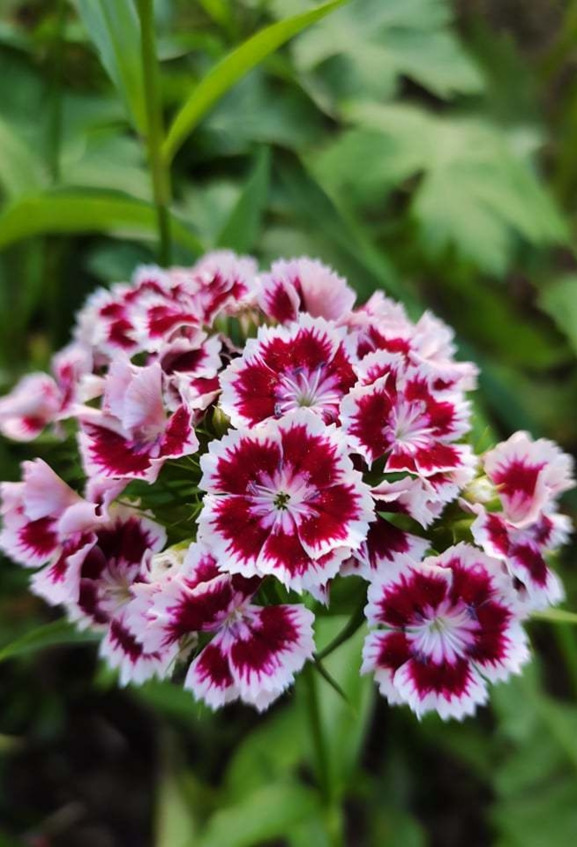 У забора вдоль их части улицы тоже растут гвоздики. Самые необычные – рядом с поворотом в лес, напротив забора дома соседнего товарищества. У этих гвоздик бело-розовый рисунок «в шашечку» – фантазия природы безгранична.