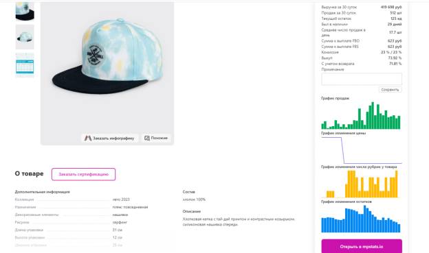 После установки в каждой карточке товаров вы увидите (графиками, цифрами) продажи или заказы за определенный период, в разрезе каждого дня или месяца, выручку, комиссию, остатки товара: