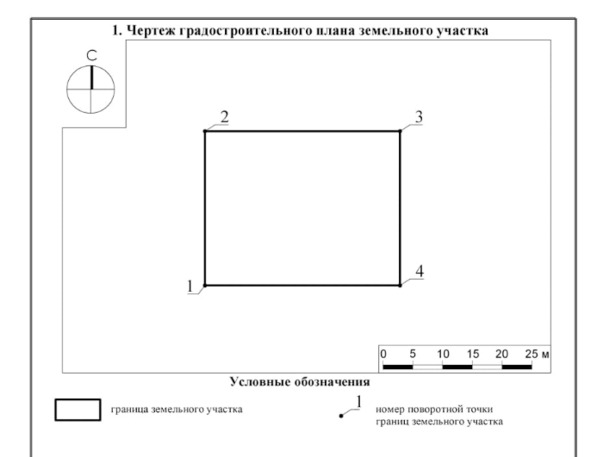 Чертёж из ГПЗУ земельного участка, на котором изображены граница земельного участка без пятна застройки.