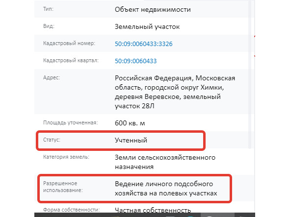 Согласно данным Единого государственного реестра недвижимости, этот земельный участок имеет статус «учтённый», то есть он был образован недавно. Далее, категория земель – «земли сельскохозяйственного назначения». Не стоит беспокоиться о категории земли, так как в настоящее время более важным фактором является территориальная зона, в которой расположен участок, и виды разрешённого использования, установленные для этой зоны.