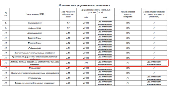 Нам нужно найти тот вид разрешённого использования, который относится к нашему земельному участку согласно сведениям из ЕГРН. В данном случае это «Ведение личного подсобного хозяйства на полевых земельных участках». Мы обнаружили, что в колонке «максимальный процент застройки» указано значение ноль.