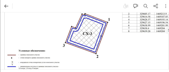 Теперь рассмотрим случай, когда мы запросили ГПЗУ для земельного участка в Тюменской области. В полученном ГПЗУ было указано три минимальных отступа от границ участка: 0 метров, 1 метр и 3 метра (Пример №5).