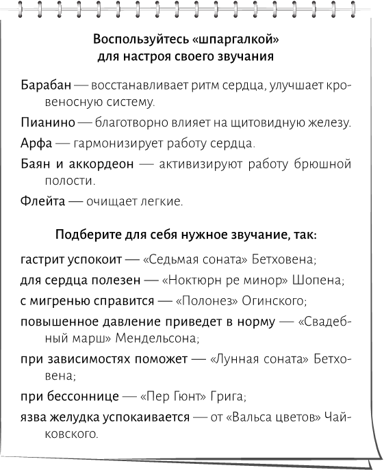 Избавление от мигрени и многих болей принесут религиозные мелодии, полонез Огинского, Моцарта «Дон Жуан», Хачатуряна «Сюита Маскарад», Листа «Венгерская рапсодия 1», «Фиделио» Бетховена, «Юморески» Дворжака.