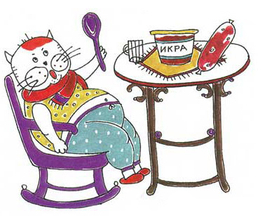 Сядет чинно ОбормотИ кладите ему в ротИ колбаску, и икру…Вот такую вёл игру.